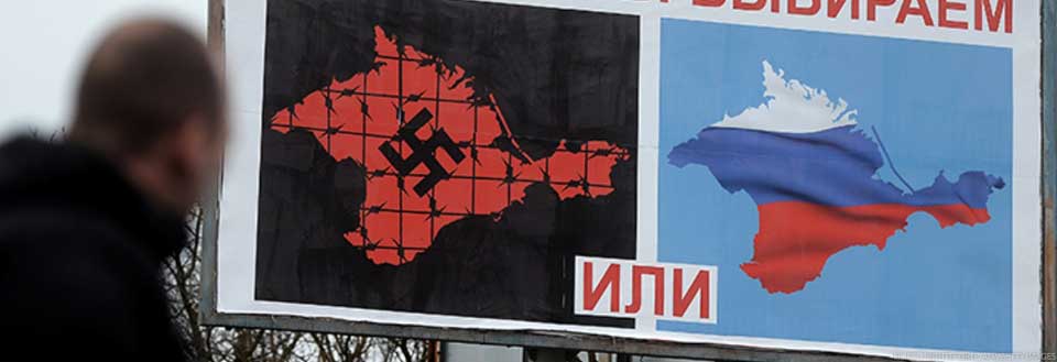 A man walks passed a billboard bearing the map of Crimea with a Nazi swastika and Russian flag reading reading ”March 16 we choose’ on the main road entering the Crimean city of Sevastopol on March 11, 2014. Lawmakers on the flashpoint Crimean peninsula voted on March 11 for independence from Ukraine ahead of a referendum on joining Russia while Washington rebuffed talks with Moscow in one of their fiercest clashes since the Cold War. The strategic region’s self-declared rulers are recruiting volunteers to fight Ukrainian soldiers while Russia’s parliament on March 11 prepared legislation that would simplify the Kremlin’s annexation of Crimea after the weekend’s vote. AFP PHOTO/ FILIPPO MONTEFORTE (Photo credit should read FILIPPO MONTEFORTE/AFP/Getty Images)