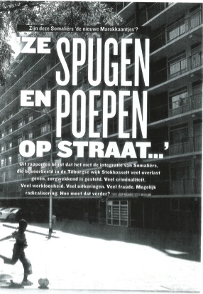 Source: Panorama.nl, NR 40 In the black box: Are Somalis ‘the new Moroccans’? Title: ‘They spit and shit on the street…’ Text: Reports show that the integration of Somalis, who give a lot of trouble in for instance the Tilburg neighborhood Stokhasselt, is in a deplorable state. Much criminality. Much unemployment. Much welfare dependency. Much fraud. Possible radicalization. What to do with this?